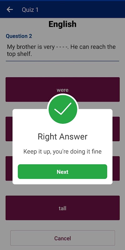 Zodra uw quiz is gemaakt, kunt u proberen deze te beantwoorden; De app laat je de vraag zien en het aantal opties dat je hebt gekozen met verschillende antwoorden, je moet het antwoord kiezen waarvan je denkt dat het de juiste is. Als het antwoord juist is, laat de app je dit weten en als het je niet het juiste antwoord laat zien.