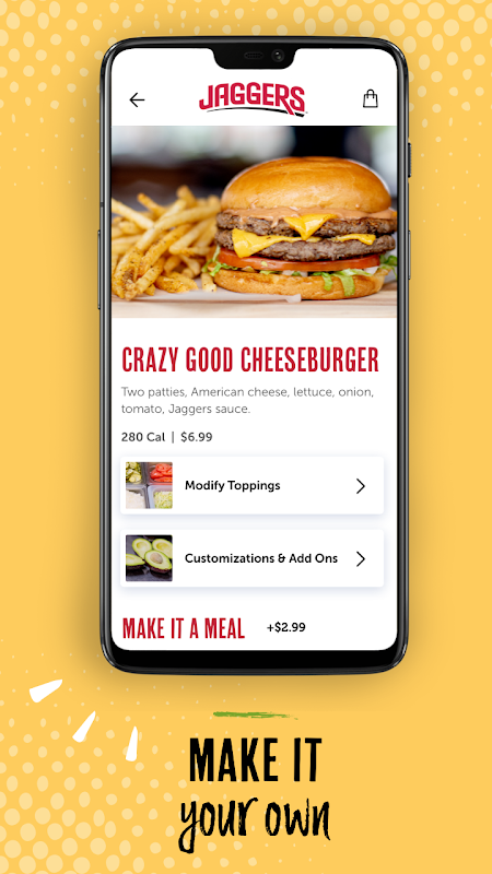 Vind je dichtstbijzijnde Jaggers en bestel vooruit voor al je favorieten zoals onze Crazy Good Cheeseburger en pas je toppings aan. Voeg ook een Strawberry Shake of Shoestring Fries toe! Kies drive-thru, carry-out of pick-up langs de kant - wat voor u het handigst is. Wanneer u aankomt, "Check In", zodat uw bestelling warm en vers wordt gemaakt. Voor ophalen aan de stoeprand voert u uw parkeerplaatsnummer en autogegevens in en wij brengen uw bestelling rechtstreeks naar u toe. Doe mee met ons Rewards-programma en verdien punten bij elke bestelling. Verzamel punten en wissel ze in voor gratis Jaggers-beloningen.