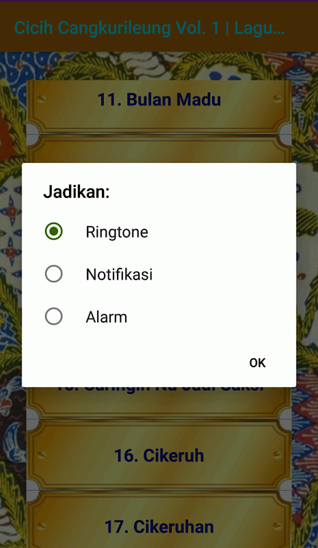 Geniet van het eerste deel van de complete collectie klassieke Sundanese Jaipongan-liederen gezongen door sinden Cicih Cangkurileung. Bevat populaire Jaipongan-liedjes uit Pasundan-land, zoals Kembang Ros Beureum, Haur Koneng, Daun Puspa, Caringin Nu Jadi Witness, Bangbung Hideung, Imut Keursaha, enz. Installeer en geniet van het prachtige geluid van Cicih Cangkurileung die originele Jaipongan-liedjes zingt.
