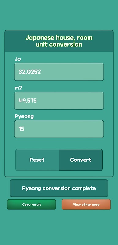 De Japanse Home Size Converter converteert elk ingevoerd gebied onmiddellijk en nauwkeurig naar 'Jō', 'Tsubo' of 'vierkante meter'.
