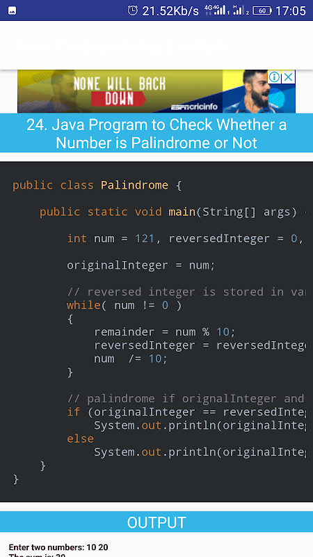 To rock java programming you must develop your skill with example or programs. Java Examples App app helps you to refer a great collection java programs on the go and Helps you improve Logical thinking of various problems related to Programming. Java Examples Application give source code and output for various Java Programs or examples.