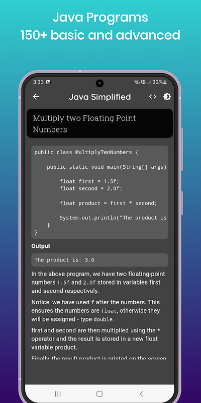 De app "Java Simplified" heeft een heel eenvoudige en interactieve gebruikersinterface. Het is de beste app waarmee je gratis de programmeertaal Java kunt leren. Waar wacht je nog op? Download de app nu en word een expert in Java-programmeertalen