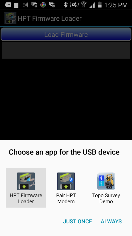 Firmware update voor Javad HPT Radio met je Android (R) apparaat via een USB-kabel.