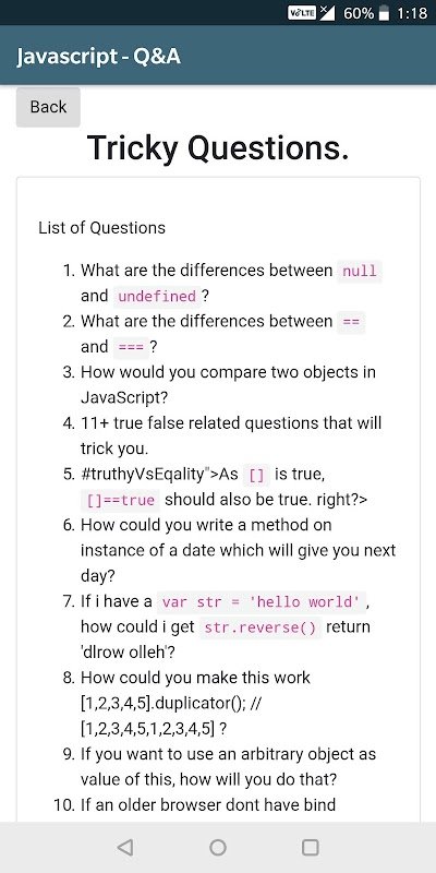 This app provides you JavaScript tricky questions, last minute preparations and rapid fire questions which helps you train your brain better and clear the interview or exam with flying colors.