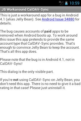 The bug causes accounts of paid apps to be removed when Android boots up. To work around this issue this app pretends to provide the same account type that CalDAV-Sync provides. That's enough to convince Jelly Bean to keep the account.