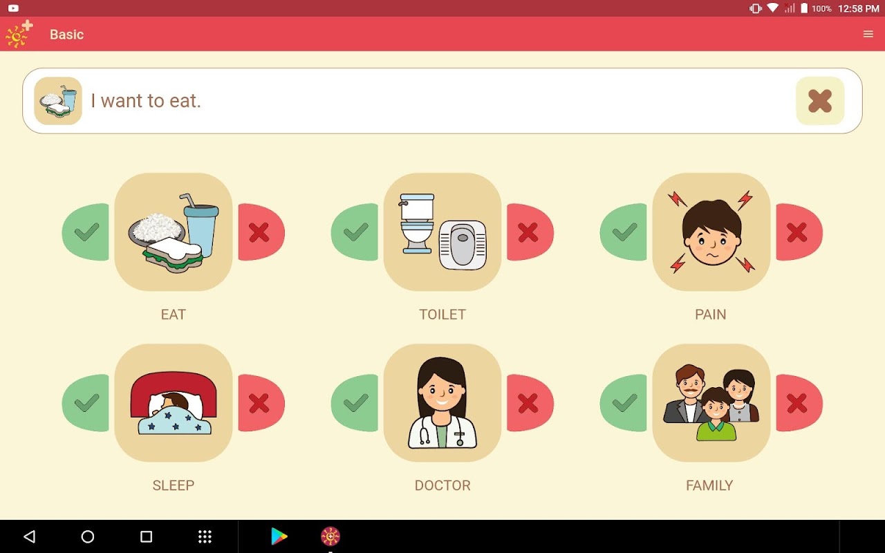 This application is organized into three levels - Basic, Intermediate and Advanced. In the basic level the user can communicate by using 6 icons with 12 predefined expressive sentences which cater to the immediate needs of the patient (like Stroke & Aphasia patients) while staying in hospital.The intermediate level provides 18 icons with 36 predefined expressive sentences that can use by patient (like Stroke & Aphasia patients) during their recovery at home.Moreover, this application allows single touch communication which makes it easier to bridge the communication gap between the patient and their caregiver, as the patient can convey their needs efficiently.