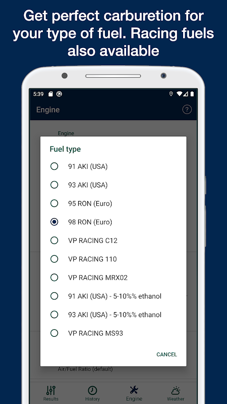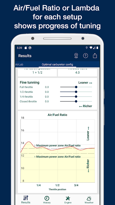• Resultaten: Op dit tabblad worden hoofdsproeier, naaldtype, naaldpositie, pilotsproeier, luchtschroefpositie, gasklep, bougie weergegeven. Deze gegevens worden berekend afhankelijk van de weersomstandigheden en de motorconfiguratie in de volgende tabbladen.