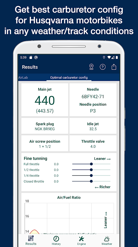 Deze app gebruikt temperatuur, hoogte, vochtigheid, atmosferische druk en uw motorconfiguratie om de optimale jetting (carburateurconfiguratie) en bougie te berekenen voor gebruik voor Husqvarna 2-takt MX- en Enduro-fietsen (TC-, TX-, TE-, CR-modellen).