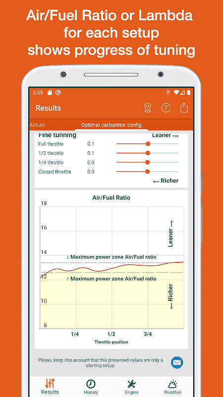 • Resultaten: In dit tabblad worden hoofdsproeier, naaldtype, naaldpositie, pilootsproeier, luchtschroefpositie, gasklep, bougie getoond. Deze gegevens worden berekend afhankelijk van de weersomstandigheden en de motorconfiguratie die in de volgende tabbladen wordt gegeven.