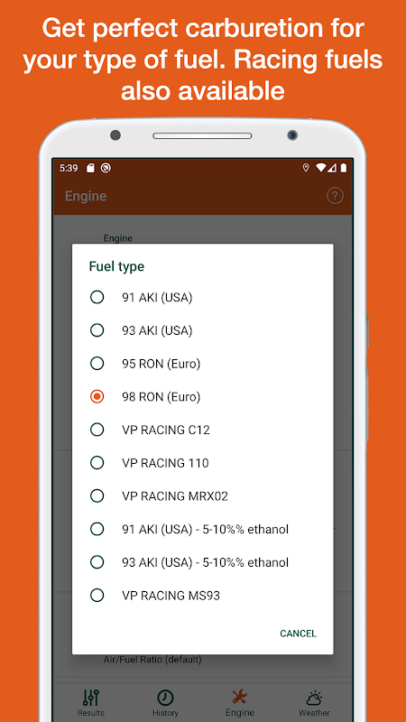 • Selecteerbaar brandstoftype (benzine met of zonder ethanol, racebrandstoffen beschikbaar, bijvoorbeeld: VP C12, VP 110, VP MRX02)