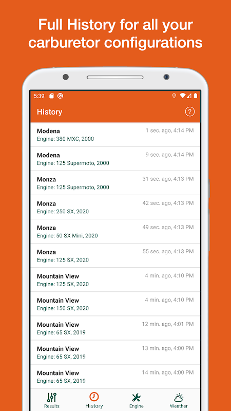 Deze app gebruikt temperatuur, hoogte, vochtigheid, atmosferische druk en uw motorconfiguratie om de optimale jetting (carburateurconfiguratie) en bougie te berekenen voor gebruik voor KTM 2-takt MX-, Enduro- en Freeride-fietsen (SX, SXS, XC, XC-W , EXC, MXC, R-modellen).