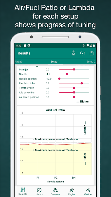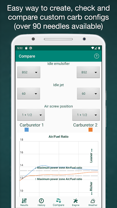 • Now you can create your carburetor and check the performance (over 90 needles available) on the 'Compare' tab