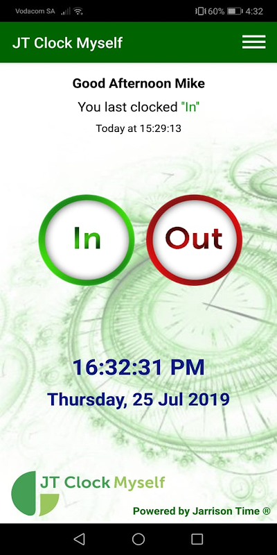 "JT Clock Myself" is een klokoplossing voor het individu. De app kan werken tegen een ruimteschema, dat de manager kan instellen voor de dag of ver in de toekomst. Hiermee maakt u een lijst met plaatsen en tijden waarop de werknemer naar verwachting in- en uitklokt. Als een boeking wordt gemist, genereert de toepassing een uitzondering. De app maakt gebruik van de biometrische technologie aan boord of de persoon kan ‘klokken’ door op een knop in de applicatie te tikken.