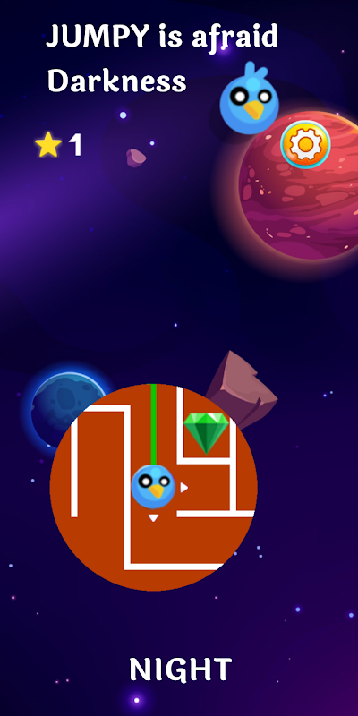 Nachtmodus: Nachtmodus voegt een extra uitdaging toe. Hier is slechts een klein gebied rond Jumpy zichtbaar, waardoor de rest van het doolhof in duisternis wordt gehuld. Terwijl je Jumpy beweegt, volgt het verlichte gebied, waardoor je gefocust moet blijven en je pad moet onthouden om de uitgang te vinden.