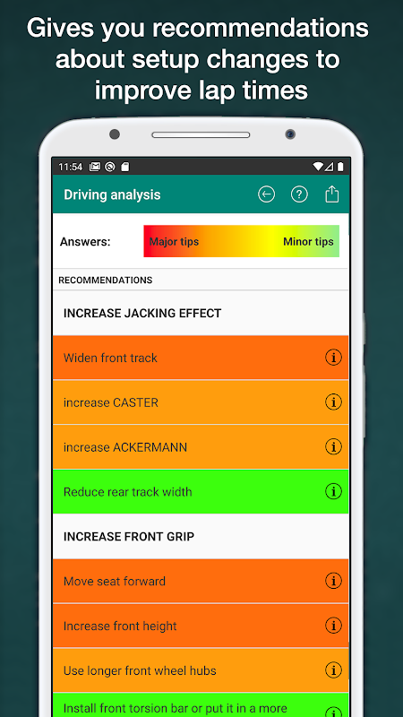 Klik op de knop "Analyse" en de app toont u aanbevelingen met betrekking tot de aanpassingen die u kunt doen om elk probleem in de chassisconfiguratie op te lossen. Er wordt een scherm weergegeven met gedetailleerde informatie over elke aanpassing. Bijvoorbeeld: "Vergroot de spoorbreedte voor", "Wijzig bandenspanning" (hoeveel u uw bandenspanning moet aanpassen), verander uw rijstijl