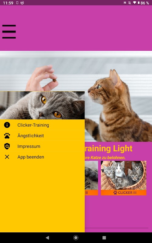 Cat Clicker Training Light - Train desired behavior with the Cat Clicker Training Light and stop your cat from unwanted behavior with this targeted training. In this light version there are three different clicker tones, the premium version contains six clicker tones. This light version has two cat profiles (success diaries), the premium version has ten cat profiles. Decide for yourself whether the light version is sufficient for you or whether you would rather switch to the premium version.
