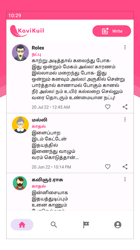 Welkom bij de beste schrijf- en leesapp om Tamil-gedichten te schrijven. In deze app kun je je schrijfvaardigheid wereldwijd delen zonder enige aarzeling en obstakel. U kunt uw geschriften lezen, schrijven, delen en publiceren in meer dan 10 categorieën.