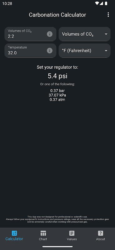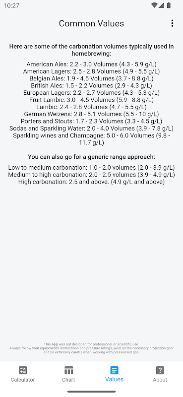 Deze app is bedoeld om thuisbrouwers te helpen bij deze taak, door een lijst te bieden met algemene carbonatatiewaarden, een gebruiksvriendelijke rekenmachine en een tabel met waarden op basis van druk en temperatuur (algemeen bekend als een carbonatatietabel) waar je visueel de gewenste instelling kunt vinden.