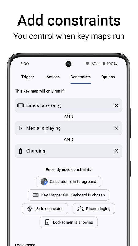 BEPERKINGEN: Je bepaalt wanneer toetsencombinaties wel en niet moeten worden uitgevoerd. Alleen nodig in één specifieke app? Of wanneer er media wordt afgespeeld? Op je vergrendelscherm? Beperk je toetsencombinaties voor maximale controle.