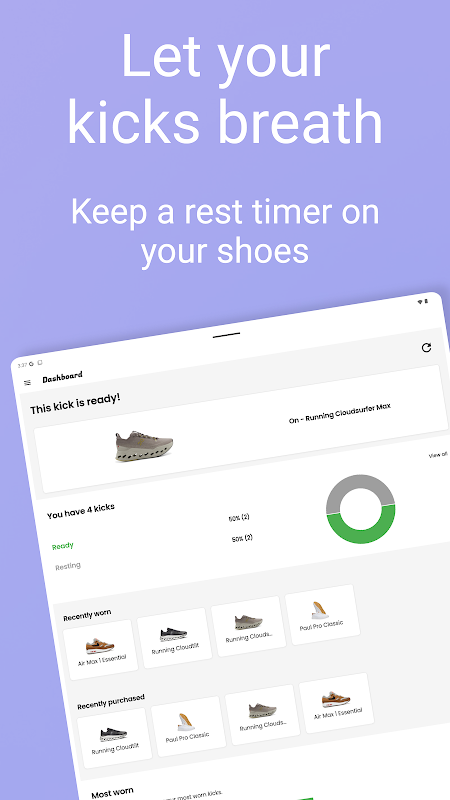 Waarom rustdagen belangrijk zijn: Sneakers hebben tijd nodig om te luchten en te ontspannen tussen het dragen. Kick Cycle houdt automatisch de rustperiodes voor elk paar bij, zodat je weet wanneer je sneakers weer klaar zijn om te dragen en wanneer ze nog wat meer tijd nodig hebben om te herstellen.