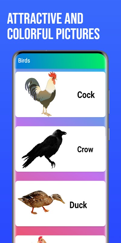 Uw kinderen zullen genieten van het leren met deze app. Het is ontworpen om kinderen te helpen kennis op te doen door schattige foto's te gebruiken en de gebruikersinterface te amuseren. Elk woord van de naam wordt duidelijk en duidelijk uitgesproken. Kinderen kunnen op een vriendelijke manier nieuwe kennis opnemen en gemakkelijk onthouden en hun kennis vergroten met behulp van deze applicatie.