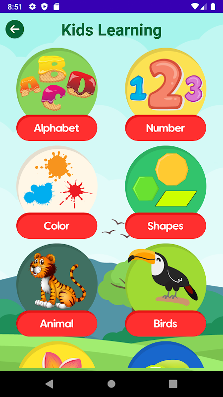 Verschillende categorieën opgenomen in de app, zoals alfabetten, cijfers, fruit, groenten, dieren, kleuren, vormen, bloemen, vogels, eten, land, maanden, lichaamsdelen, sport, huismaterialen, naam van de baan en nog veel meer. Om de luisterkracht van kinderen te verbeteren en ook een quiz inbegrepen.