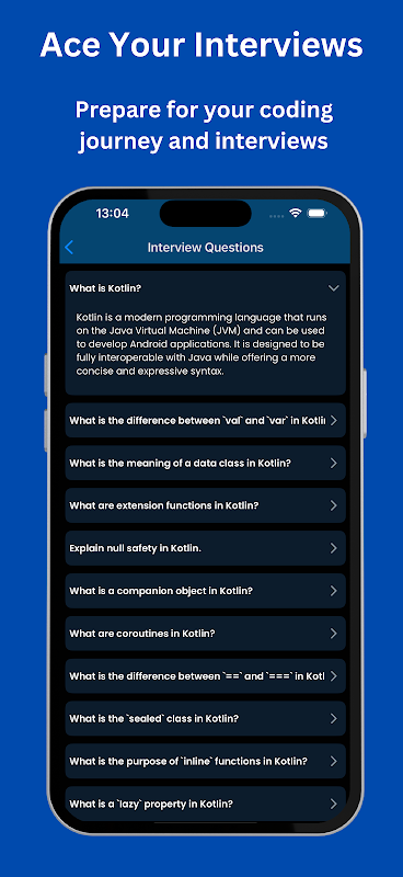 Ontdek geavanceerde concepten zoals Kotlin-coroutines, Kotlin-collecties en nulveiligheid door middel van gedetailleerde lessen en oefeningen. De app biedt Kotlin-uitdagingen om je codeervaardigheden aan te scherpen en praktische ervaring op te doen met problemen uit de echte wereld. Je kunt ook Kotlin-bibliotheken integreren en de kracht van de Kotlin-syntaxis ontdekken om mobiele apps te bouwen.