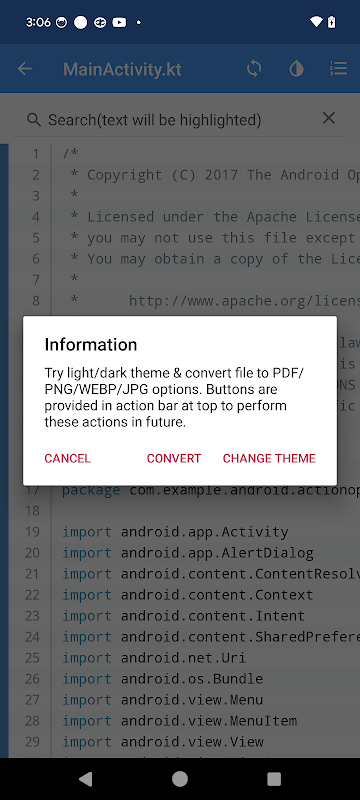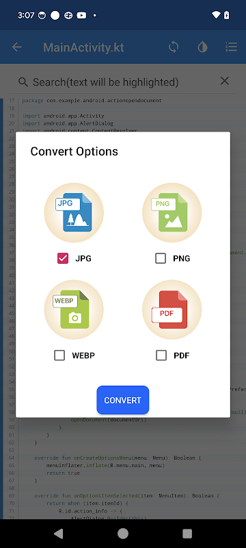 Bekijk de inhoud van Kotlin-bestanden op een mobiel apparaat en converteer naar JPG, WEBP, PNG en PDF.