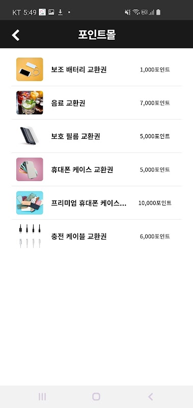 5) 포인트몰: 보유하고 계신 포인트로 매장에서 수령 가능한 다양한 상품을 구매할 수 있는 메뉴입니다.