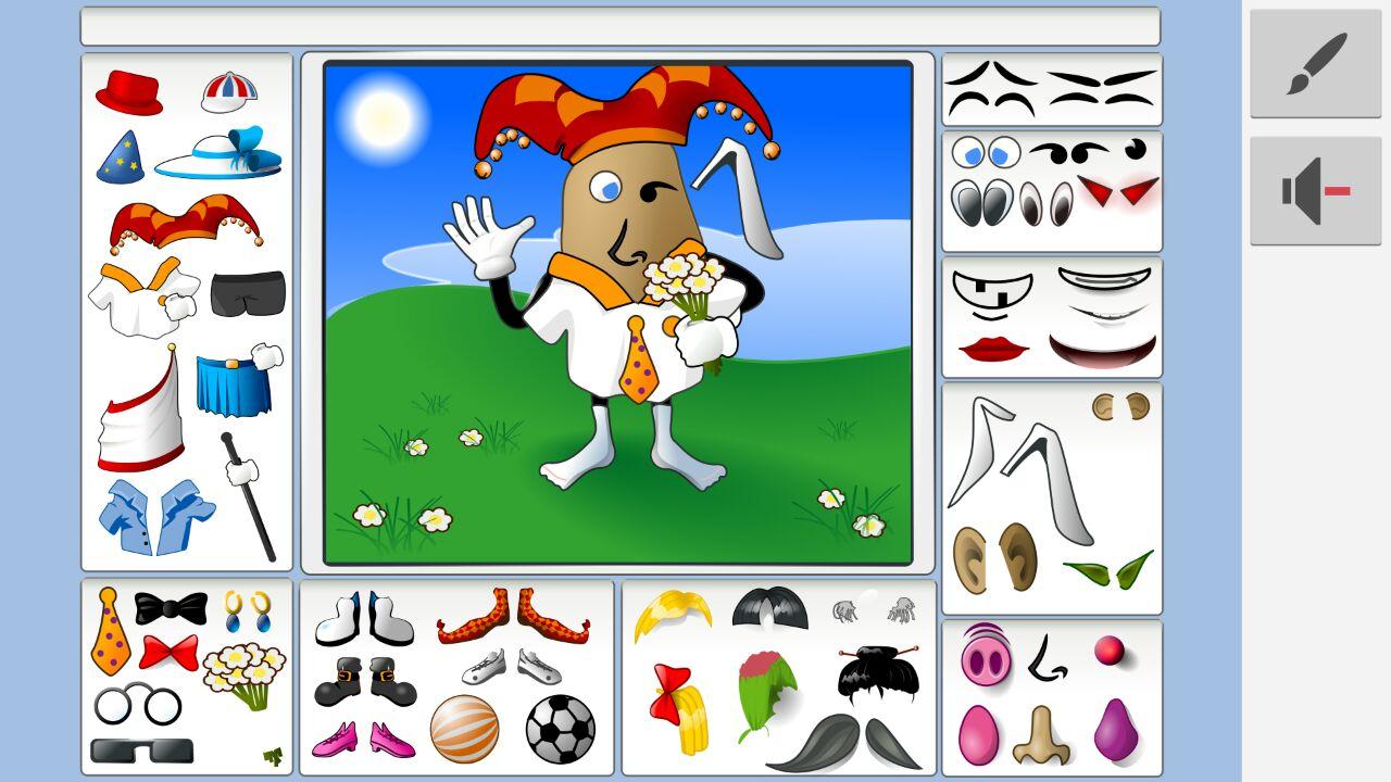 Het is een "aardappel editor". Dat betekent dat u kunt slepen en neerzetten ogen, monden, snor, en andere delen van het gezicht en goodies op een aardappel-achtige vent. Op dezelfde manier, heb je andere speeltuinen met verschillende thema's.