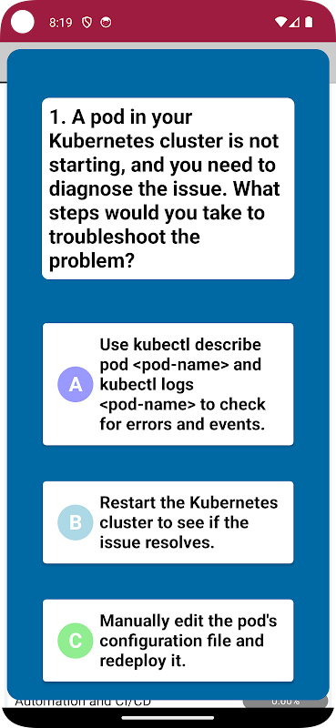 Beheers Kubernetes en behaal uw certificeringsexamens met onze Kubernetes Exam Practice-app! Deze app is speciaal ontworpen voor aspirant-Kubernetes-professionals en biedt een uitgebreide verzameling oefenvragen gebaseerd op scenario's uit de echte wereld. Verbeter uw vaardigheden, test uw kennis en krijg het vertrouwen dat nodig is om te slagen in de examens Certified Kubernetes Administrator (CKA) en Certified Kubernetes Application Developer (CKAD).