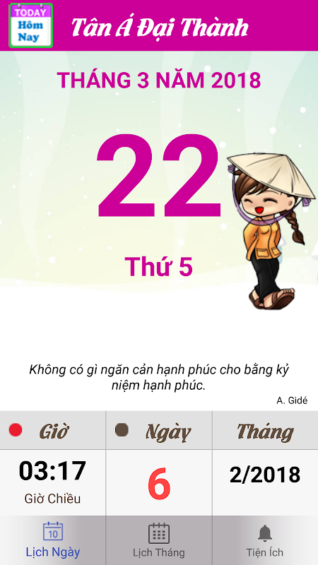 Ứng dụng Lịch Vạn Niên Tân Á 2019 xem lịch ngày và tháng nhanh chóng và vô cùng chính xác. Cho phép bạn xem lịch âm cũng như lịch dương và thông báo các ngày đặc biệt trong tháng trong năm. Ngoài ra nó còn là một công cụ mạnh mẽ chuyển đổi ngày âm sang dương và ngược lại. Đồng thời nó còn hiển thị các danh ngôn tục ngữ hay làm cho bản thân bạn có thêm sức sống và động lực làm việc, tình yêu, cuộc sống ...... Ứng dụng lịch điện tử vạn niên này hoàn toàn có thể thay thế được lịch truyền thống dán tường. Và hơn bao giờ hết bạn không cần phải thay lịch hàng năm như lịch truyền thống. Ứng dụng sẽ tự cập nhật lịch hàng năm hàng tháng chính xác một cách tuyệt đối. Lịch âm dương vạn sự như ý.