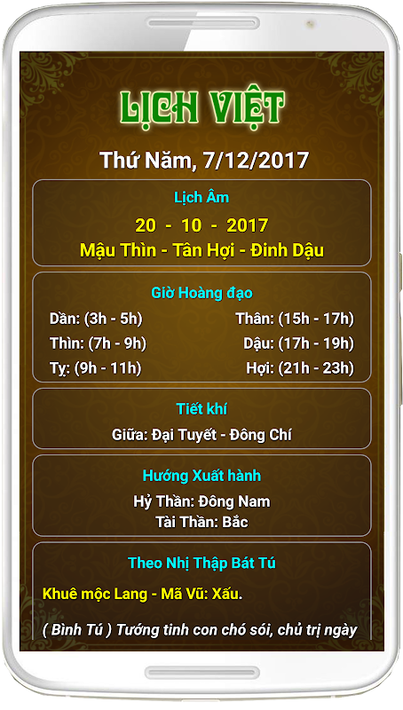 Vietnamese kalender - Volkskalender bevat veel handige functies en hulpprogramma's, zoals het weer, gebeden, vertrekinstructies, goede en slechte dagen,...