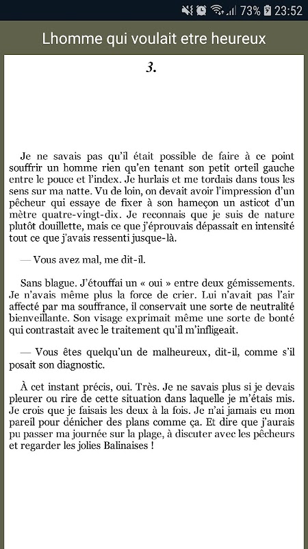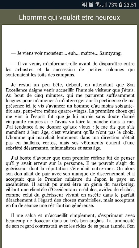 De verteller zal tijdens zijn verblijf in Bali al zijn vragen moeten stellen met zijn ontmoeting met de heler, of om precies te zijn, een spiritueel leraar met de naam Samtyang. De laatste zal de verteller leren vooruitgang te maken door hem een aantal kleine taken te geven om hem te helpen ontdekken wie hij werkelijk is en om vooruitgang te boeken om zich beter in zijn leven en in zijn hoofd te voelen. Omdat ja, de verteller heeft een beroep (hij is een leraar), dus hij verdient een goede boterham (zelfs als hij af en toe het hoofd neemt met zijn bankier vanwege zijn overdisposities) maar hij heeft niemand in zijn leven en meer dan wat dan ook, hij is niet gelukkig. Meester Samtyang zal hem helpen erachter te komen wat hij moet doen om het te veranderen!