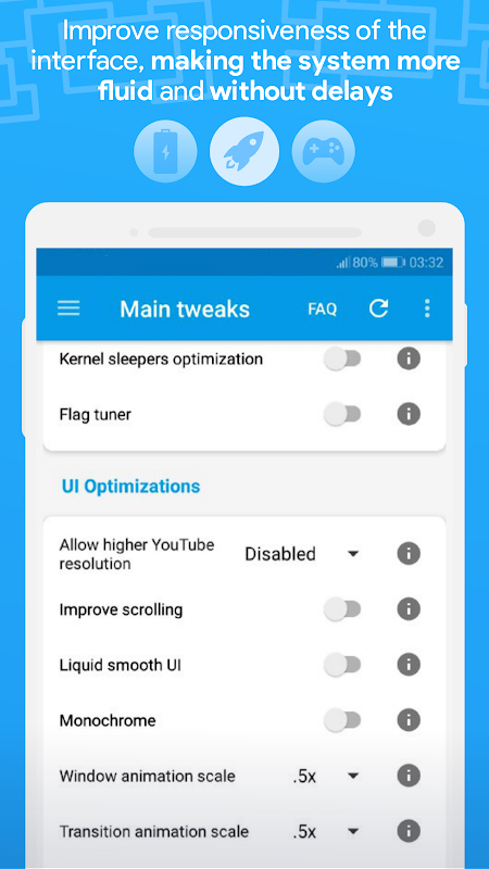 L Speed comes with a nice and clean user interface. Options such as tweaks are separated with sections, their explanation can also be opened with a long click. L Speed also supports changing theme colors, with Light and Dark option available to suit everyone's taste.
