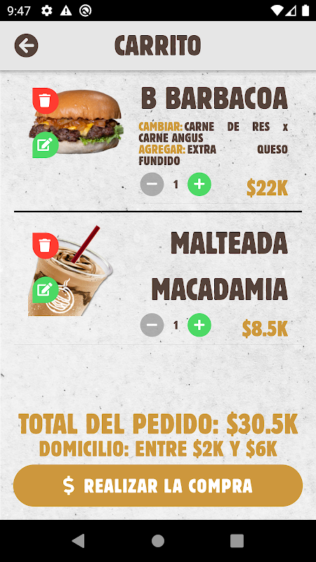 Met de Farm Burger App kunt u bestellingen plaatsen in de stad Neiva van zondag tot donderdag van 11:30 tot 23:00 uur en van vrijdag tot zaterdag van 11:30 uur tot 23:30 uur zonder een telefoon te hoeven bellen, pas je hamburger aan, zet je bestelling aan met de combinaties die je leuk vindt, ken de hoeveelheden en waarde van je bestelling, voer je gegevens in, het type betaling en verstuur het.