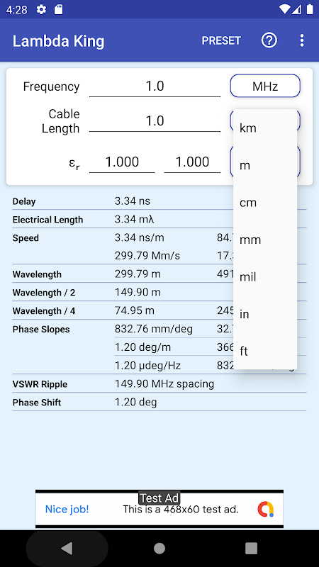 Een snelle en handige rekenmachine voor het weergeven van de parameters van een bepaalde frequentie, kabellengte en snelheidsfactor. De ingangen staan de meeste achtervoegselvermenigvuldigers toe (zoals MHz, kHz, cm, mm, in, etc.) om snelle en gemakkelijke invoer mogelijk te maken.