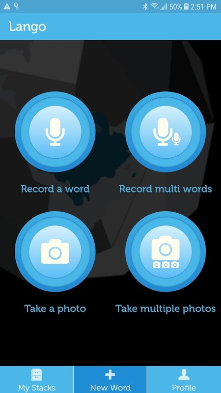With a Tutor: Whether your are using a book to guide you or simply working through topics you are interested in, Lango can help you record, organize, and study vocabulary on your own. It's nice to work with a native because you can make cards for every new word as you learn it. You can also go out with your tutor and do some exploring with the app to add to your personal language database or bring pictures back to class and make stacks out of recent trips, interactions, or interests