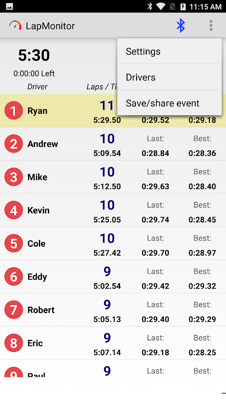 Lap Monitor geeft uw positie, naam, totale tijd en beste ronde weer