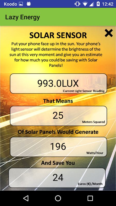 Lazy Energy uses your phones GPS, light and microphone sensors to help you identify the best types of green energy that you can harness.