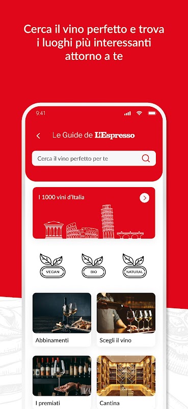 GUIDEESPRSSO helpt u bij het kiezen van de juiste wijn op basis van uw smaak en het voedsel dat u kiest dankzij een database met meer dan 1.000 wijnen die zorgvuldig zijn geselecteerd door Luca Gardini, een van de toonaangevende experts op het gebied van wijnproeven en bekroond als de beste sommelier ter wereld. Dankzij de scores en de bijbehorende proefnotities heeft u de volledige kaarten binnen handbereik en kunt u snel uw wijnen of zelfs uw favoriete wijnhuizen opslaan onder de 500 geselecteerde in heel Italië.