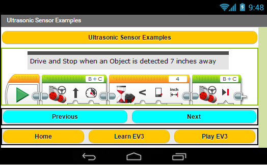 With the Learn and Play EV3 Mindstorm app you will have access to five different Interactive Tutorials. A brief description of each of the five sensors featured in the app along with at least two examples of programs for each of them.
