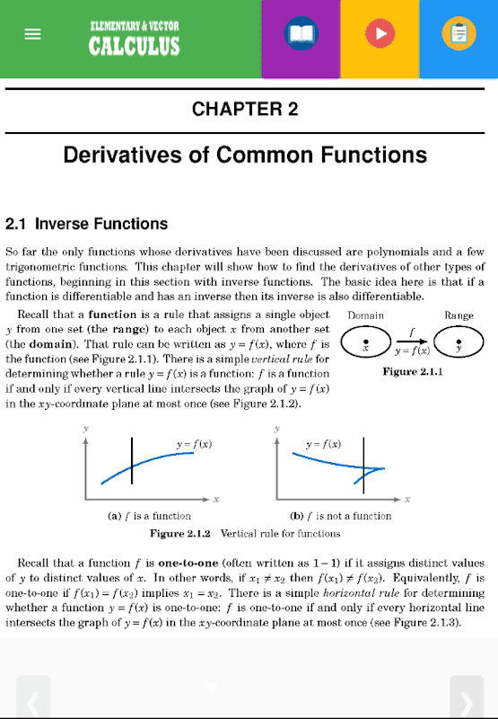 This app contains two classics, Elementary Calculus and Vector Calculus both written by Prof Michael Corral, Professor, Mathematics Department, Schoolcraft College , Livonia, Michigan, USA.