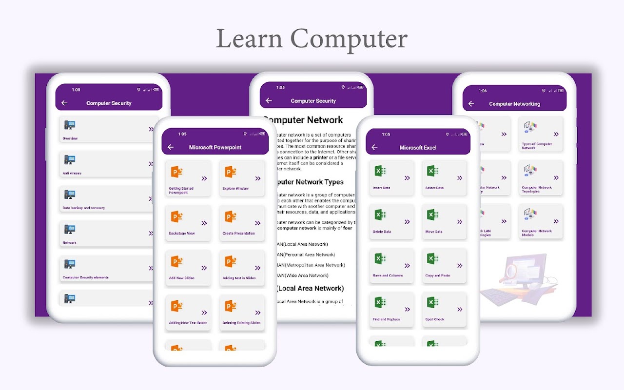 Learn Computer Course is an application that is simple to use for all types of users and allows them to simply learn their selected course on a regular basis. The application works totally offline, and all beginners who want to acquire basic knowledge of computers should install it on their own mobile device. Learn about computers and the fundamentals of computer hardware and software with this programme.