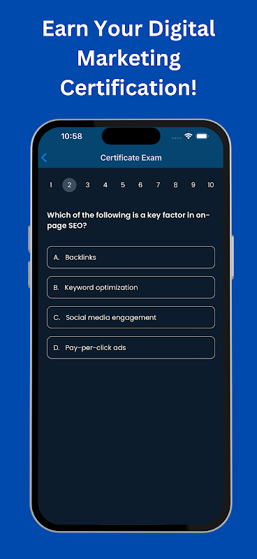 AI-aangedreven leren: De app beschikt over een slimme AI-docent die u stap voor stap door elk digitaal marketingconcept leidt. Bent u in de war over zoekwoordonderzoek of het bijhouden van conversies? De AI legt het uit met duidelijke uitleg, praktische voorbeelden en gebruiksscenario's. Je leert strategisch denken, campagnes implementeren en prestaties meten als een professional.