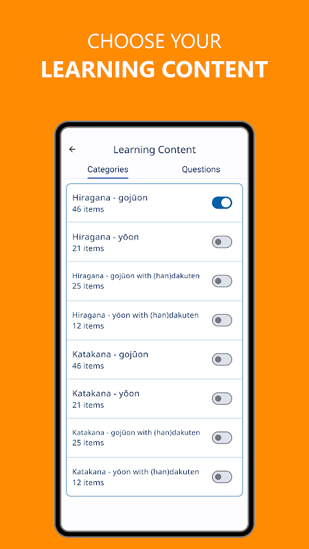 Begeef je op een spannende reis van kennis naar het rijk van de Japanse taal. Leer moeiteloos de karakters Hiragana en Katakana herkennen. Of het nu de Kanas van Gojūon en Yōon zijn, met of zonder (Han)Dakuten, of hun nauwkeurige uitspraak – jij beheerst het allemaal!