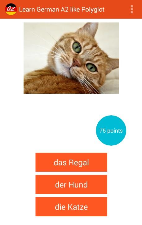 This app is focused on the A2 level though it will be useful also for many other. Contains the German words from categories furniture, communication, fruit, vegetables, parts of a body, animals, office and others