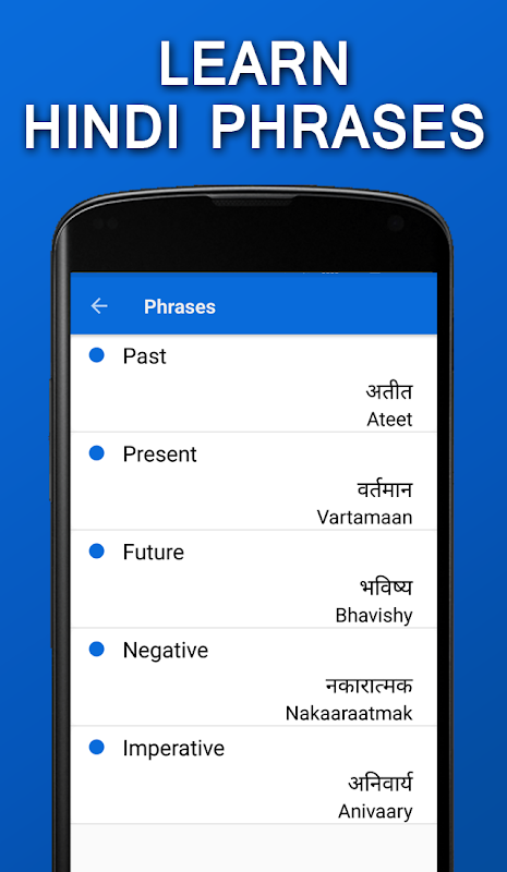 Easily Learn Hindi in an easiest and fastest way to learn Hindi quickly. This language learning app will not only help you learn Hindi grammar, hindi vocabulary, hindi tenses, hindi alphabets, but also will enable you to learn and speak Hindi Language quickly. Learn Hindi Language quickly can be your own travel phrasebook with the most frequently used hindi phrases and hindi words on tour and also contains hindi sentenses and hindi conversations. Learn Hindi through English Language with our free Hindi translation and Hindi transliteration app.