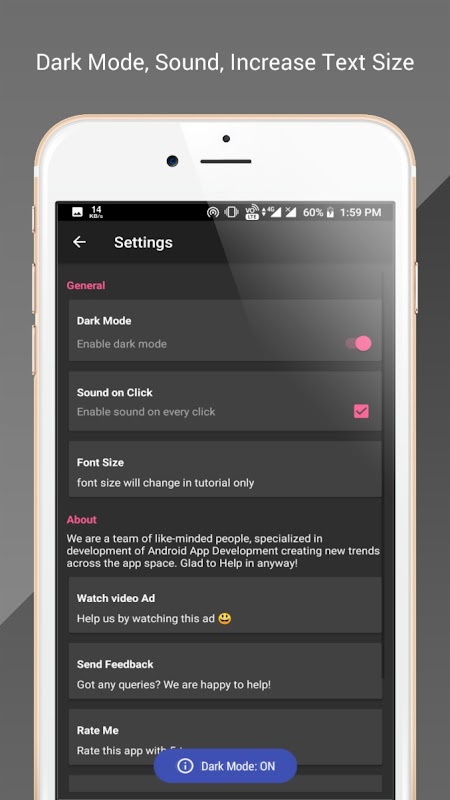 🔥 Setting- Customize your app with features like Dark Mode, Changing Font Size & Sound on Touch of Button & Card. Get in touch with us for suggestions, bugs and queries.