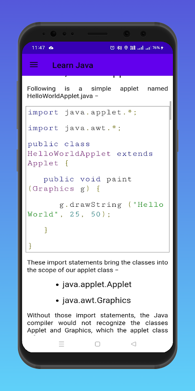 Java is a high-level programming language originally developed by Sun Microsystems and released in 1995. Java runs on a variety of platforms, such as Windows, Mac OS, and the various versions of UNIX. This app gives a complete understanding of Java. This reference will take you through simple and practical approaches while learning Java Programming language.